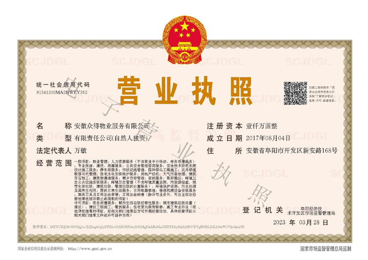 - 安徽眾得物業(yè)服務(wù)有限公司成立于2017年08月,注冊(cè)資金一千萬(wàn)元。自公司成立以來(lái),始終遵循“業(yè)主至上、服務(wù)第一”的企業(yè)宗旨,發(fā)揚(yáng)“團(tuán)結(jié)、務(wù)實(shí)、開(kāi)拓、創(chuàng)新”的企業(yè)精神,樹(shù)立了“以人為本、人性化管理,以客為尊、讓客戶(hù)滿(mǎn)意”的經(jīng)營(yíng)理念,創(chuàng)立了具有眾得特色的物業(yè)服務(wù)模式。 基礎(chǔ)服務(wù) 保潔服務(wù):小區(qū)保潔、單位保潔、商場(chǎng)保潔、醫(yī)院保潔...... 保安服務(wù):小區(qū)保安、單位保安、商場(chǎng)保安、醫(yī)院保安...... ...